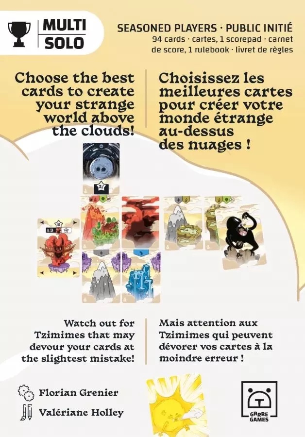 Contenu 93 cartes dont : 1 carte Soleil – 4 cartes Terre de départ – 60 cartes Terre – 5 cartes Ville Sombre – 11 cartes Fumerole – 8 cartes Voyageur – 4 cartes Aide de jeu – 1 carnet de score – 1 livret de règles.