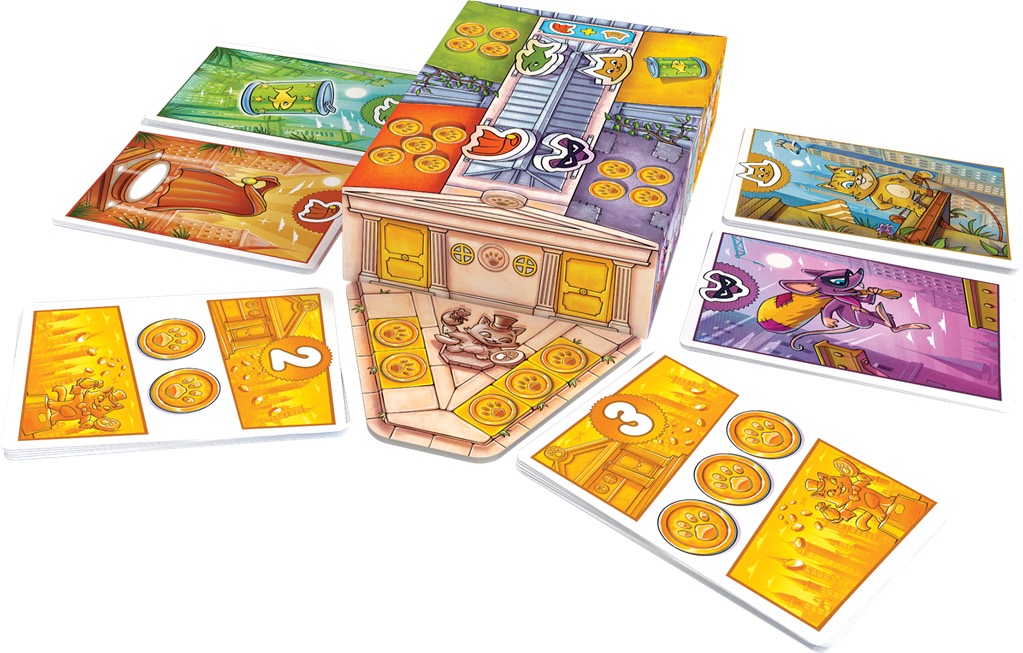 À partir des mêmes cartes de départ, chaque joueur compose sa propre pioche en achetant de nouvelles cartes au marché ou à la banque, pour construire son paquet. Jeter les cartes qui ne vous sont plus utiles. Soyez le premier à réunir et révéler une carte Chat et une carte Cape pour retrouver Super Miaou et gagner la partie ! Une initiation au jeu de construction de decks.