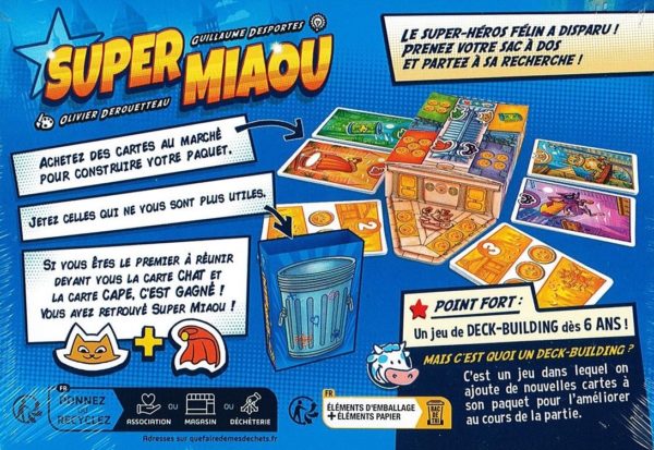 Soyez le premier à révéler une carte Chat et une carte Cape pour recruter Super Miaou et gagner la partie ! Une initiation au jeu de « Deck-Building » construction de decks par ajout de nouvelles cartes pour améliorer son paquet durant la partie…