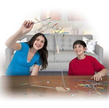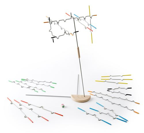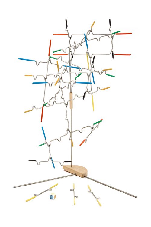 Tirez au sort à l’aide d’un dé la pièce à placer (une baguette métallique plus ou moins longue avec de une à cinq encoches pour s’accrocher). Reste alors à la placer sur le mobile constitué des pièces déjà suspendues mais sans les faire tomber ! Vous récupérez les pièces que vous faites choir : le premier qui n’a plus de baguettes à mettre ni dans sa réserve ni dans la réserve commune a gagné.