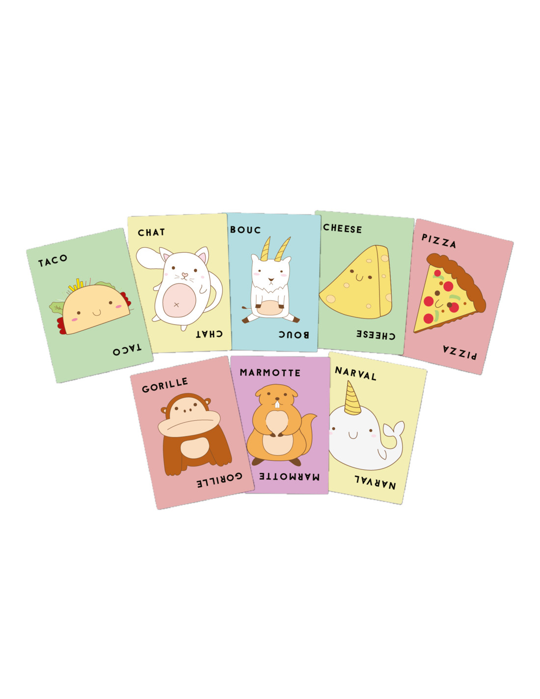 Taco Chat Bouc Cheese Pizza ! Taco Chat Bouc Cheese Pizza! Gardez bien ces 5 mots loufoques en tête. Dès qu’une carte correspondant au mot annoncé est révélée, tapez la pile centrale. Le dernier ramasse tout ! Soyez observateurs et vifs pour vous débarrasser de toutes vos cartes! La moindre erreur vous coûtera des cartes de pénalité : ni feinte, ni approximation dans ce jeu de défausse complètement frénétique et farfelu.