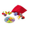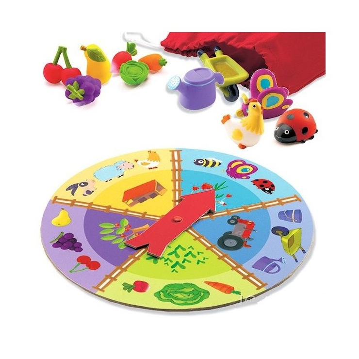 Contenu : 1 roulette partagée de 5 zones (univers de la ferme), 15 figurines en plastique souple liées aux zones, 1 sac en tissu.