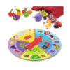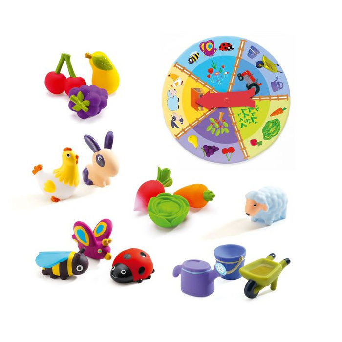 On place une petite roue plateau au centre de la table. La roue est divisée en 5 zones de 3 éléments différents associés à l’univers de la ferme. A son tour de jeu, l’enfant va faire tourner la petite flèche de la roue pour connaitre : l’objet (le seau, la brouette et l’arrosoir), l’insecte (l’abeille le papillon et la coccinelle), le fruit (les cerises, la poire, le raisin), le légume (la carotte, la salade et le radis) ou l’animal (poule, lapin, mouton) à retrouver uniquement au touché dans le sac en tissu.
