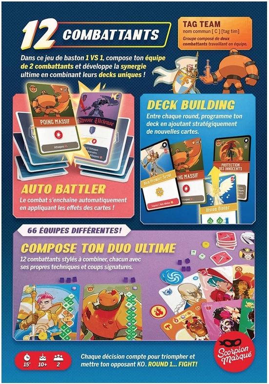 Tag Team… Prépare ton deck, crée ton équipe et entre dans l’arène ! Pour un affrontement explosif et fun, mêlant deckbuilding et auto battler dans l’univers survolté du combat d’arcade. Dans ce jeu de société, créez un duo de choc et enchaînez les combos pour mettre votre adversaire KO.