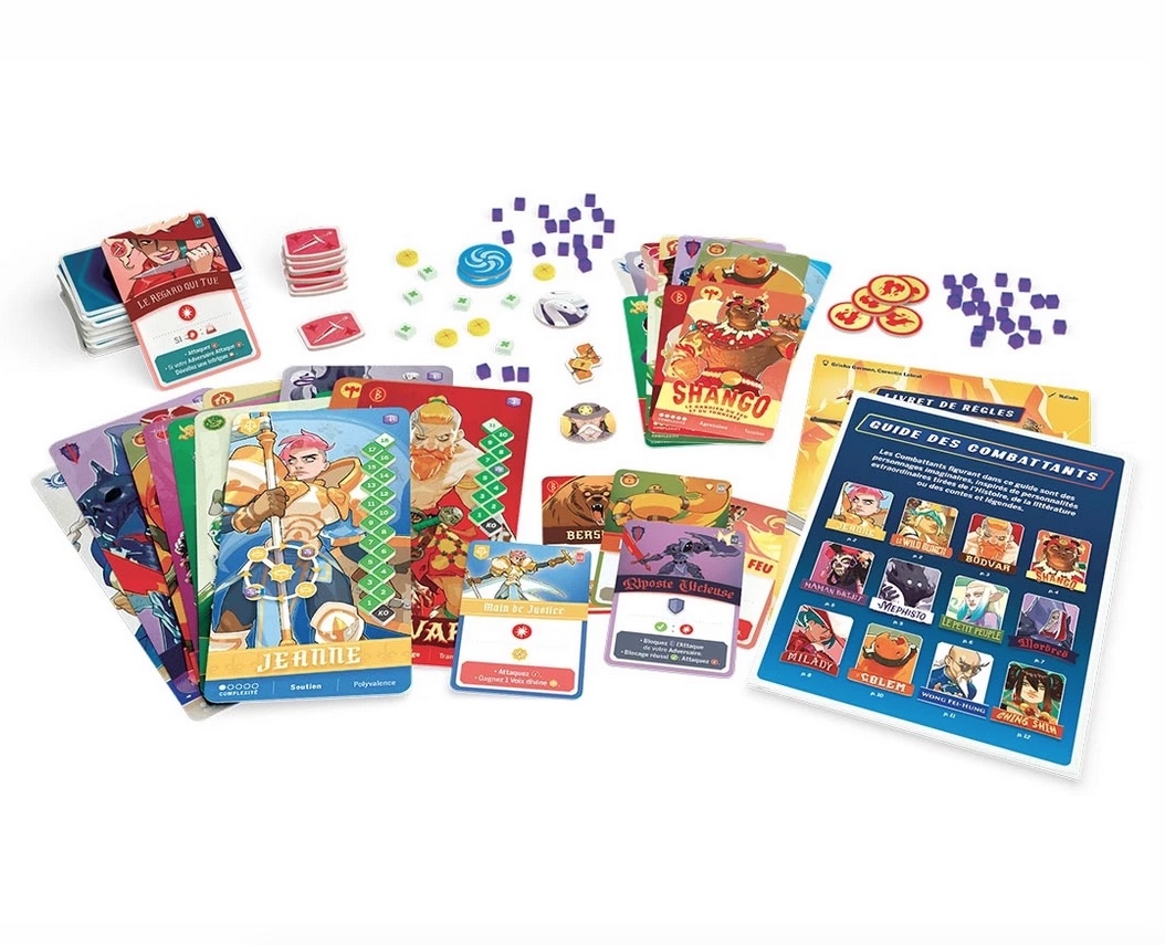 Contenu : 1 Guide des Combattants  12 plateaux Combattants  12 cartes de Sélection  120 cartes Combat (10 par combattant)  40 cubes de Puissance (violet)  6 marqueurs de Points de vie (vert)  4 marqueurs spéciaux (jaunes)  1 Jeton Shérif  1 Jeton Golem  1 Jeton Serpent  2 Jetons Concentration  5 Jetons Flamme  11 Jetons Intrigue, 1 livret de règles.