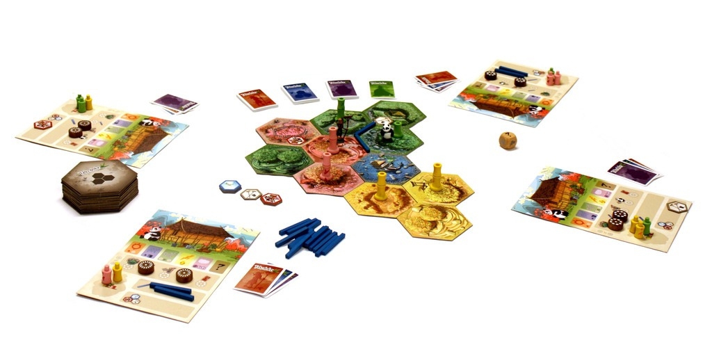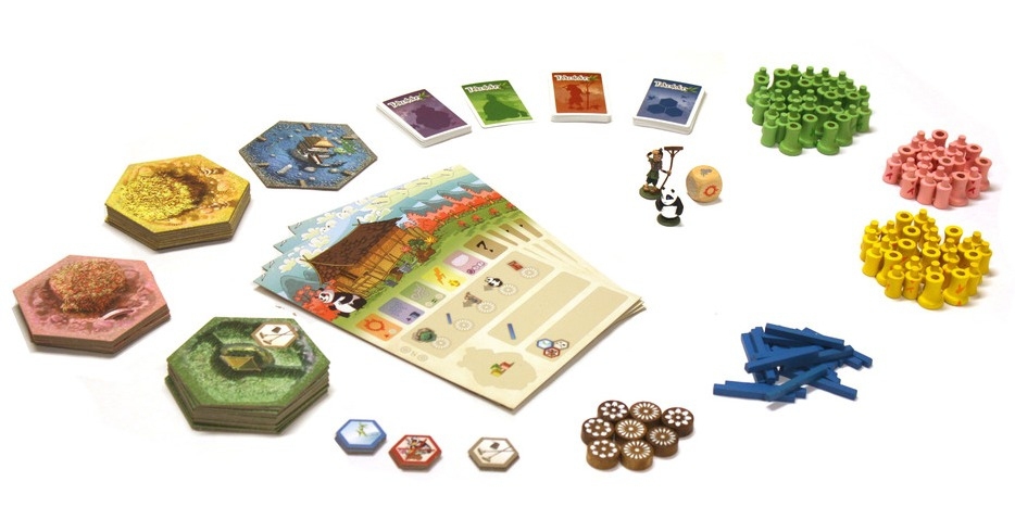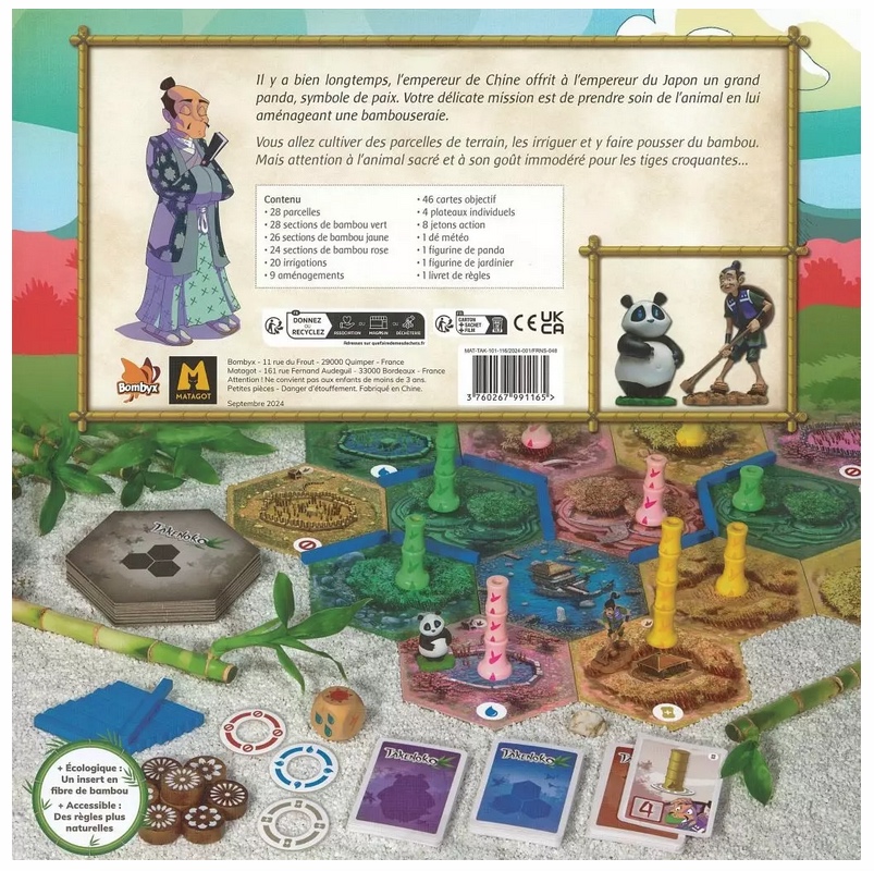 Contenu : 28 tuiles (parcelles), 90 sections de bambou, 20 irrigations, 9 aménagements, 46 cartes objectifs, 4 plateaux individuels, 8 jetons action, 1 dé météo, 1 figurine de panda, 1 figurine de jardinier, 1 livret de règles.