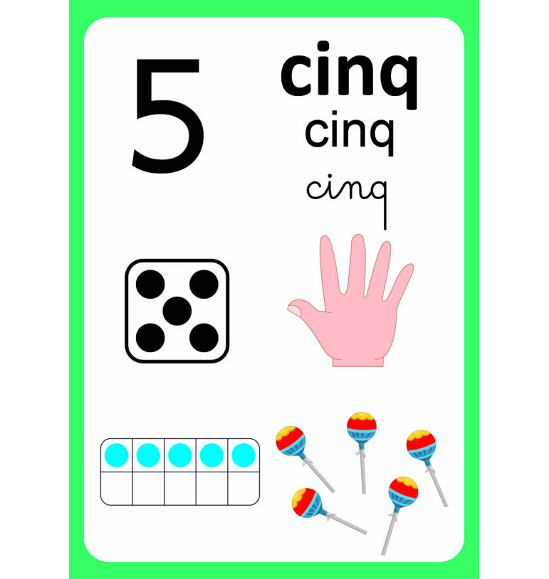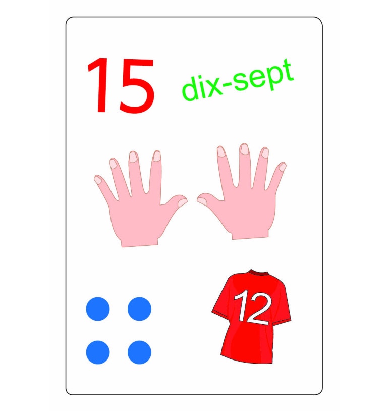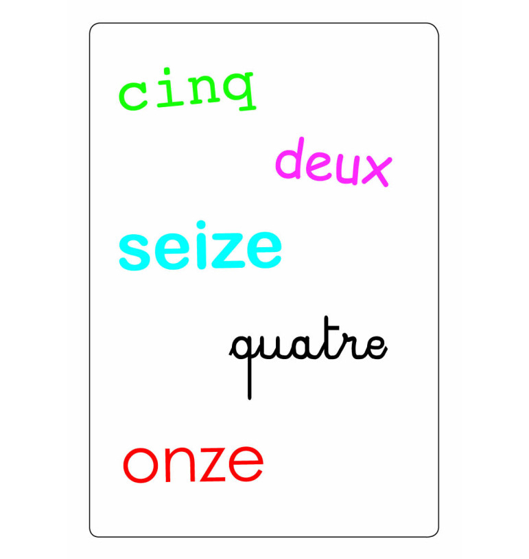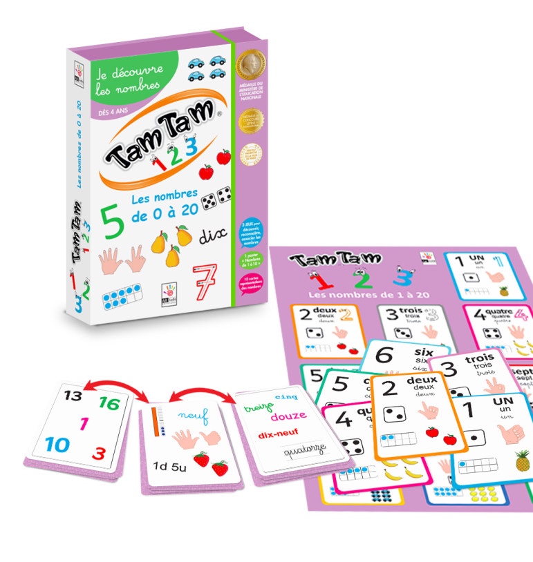 Contenu : 73 cartes (63 cartes avec les nombres en chiffres, en lettres et des représentations variées et 10 cartes aide-mémoire – 7 x 9,9 cm), 1 poster réversible (1 face avec les nombres 1 à 10, 1 face avec les nombres de 1 à 20), règles, dans un coffret de rangement robuste.