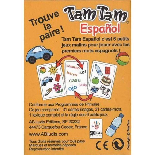 Tam Tam Espagnol est un jeu de de cartes avec des illustrations attrayantes, des règles simples et variées pour découvrir et apprendre des mots. Pratique, ludique et … 100 % malin ! Ce jeu permet de jouer et d’apprendre les premiers mots simples en espagnol. Le joueur doit retrouver l’unique paire image-mot qui existe entre une carte-images et une carte-mots .