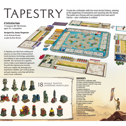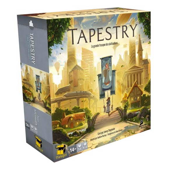 Avec seulement 4 pages de règles, la complexité et les variations de Tapestry émergent des 16 civilisations uniques, 43 cartes de tapisserie, 33 cartes techniques et 3 dés personnalisés.