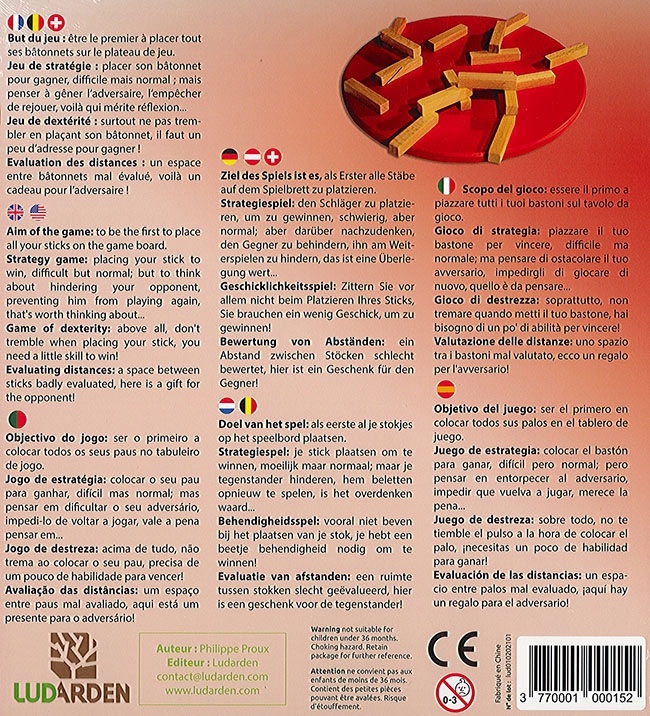 Contenu : 1 Plateau rond en bois et 60 bâtonnets identiques en bois. 1 Règle du jeu en 7 langues (F, GB, NL, D, I, E, P).