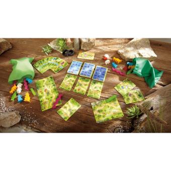 Contenu : 24 animaux en bois (L. serpent 7,2 cm), 48 cartes piste, 12 cartes duel, 4 cartes départ, 4 cartes de manche, 2 sacs en tissu, règle et variante.