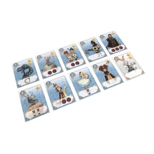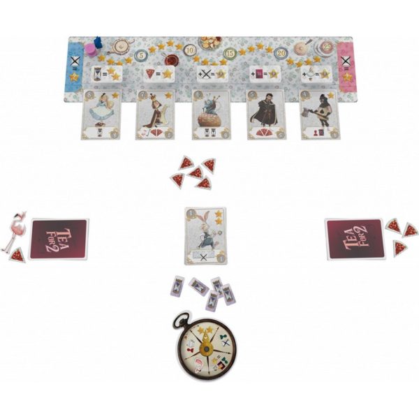 Contenu : 50 cartes Personnage, 1 tuile Flamant rose, 5 tuiles Objectif (double face), 2 pions Joueur (Lièvre de mars et Chapelier fou), 2 jetons Tasse de thé, 5 jetons Sablier, 9 jetons Tarte, 1 plateau de Score, 1 plateau Montre à aiguille.