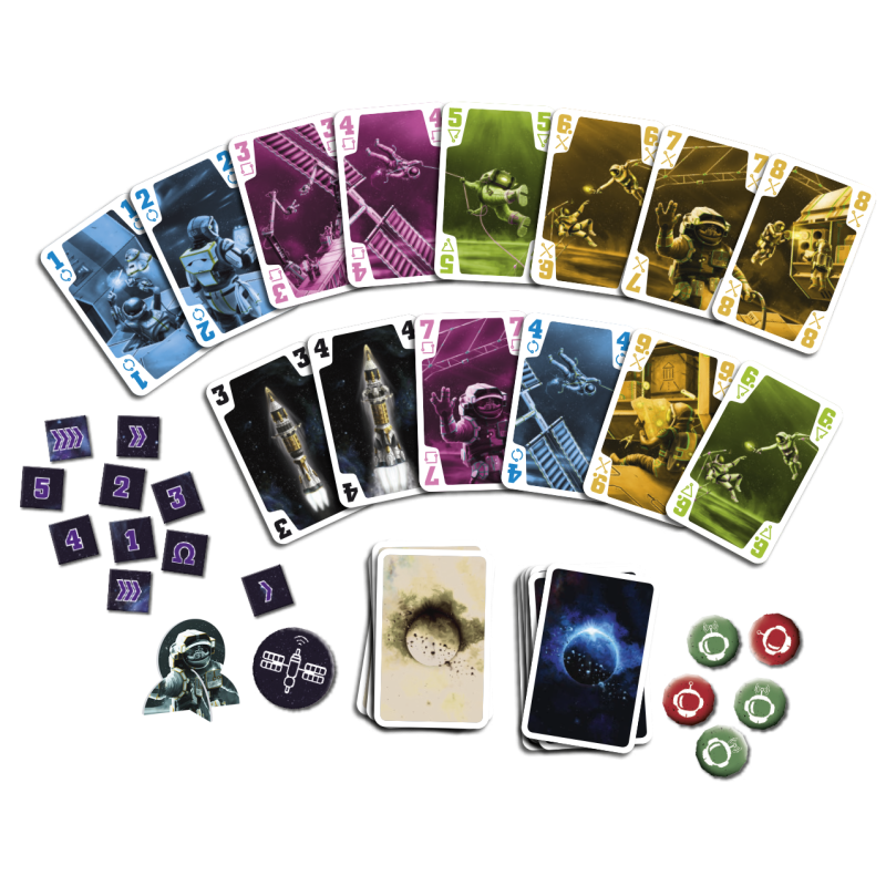 Contenu du jeu : 40 cartes Espace, 5 cartes Rappel, 36 cartes Tâche, 16 jetons, 1 pion Commandant, 1 livret de règles/journal de bord.