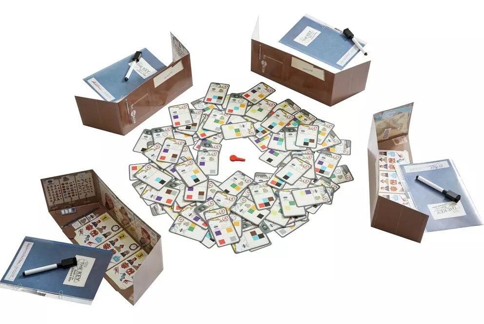 Chacun prend un porte-documents paravent, un feutre et un dossier d’enquête. Répartissez toutes les cartes faces cachées au milieu de la table. Choisissez une clé et posez-la à côté. Tout le monde enquête en même temps : ne prenez sur la table que des cartes portant la couleur de la clé !