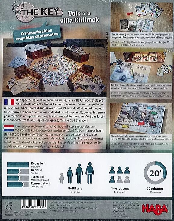 The Key – Vols à la villa Cliffrock vous devez mener l’enquête en relevant les indices postant sur les coupables, l’heure du délit, le butin et leur fuite. Trouvez la bonne combinaison de chiffres et avec la clé, ouvrez la serrure pour mettre les coupables derrière les barreaux. Mais attention, ce n’est pas forcément le détective le plus rapide qui gagne mais le plus efficace !