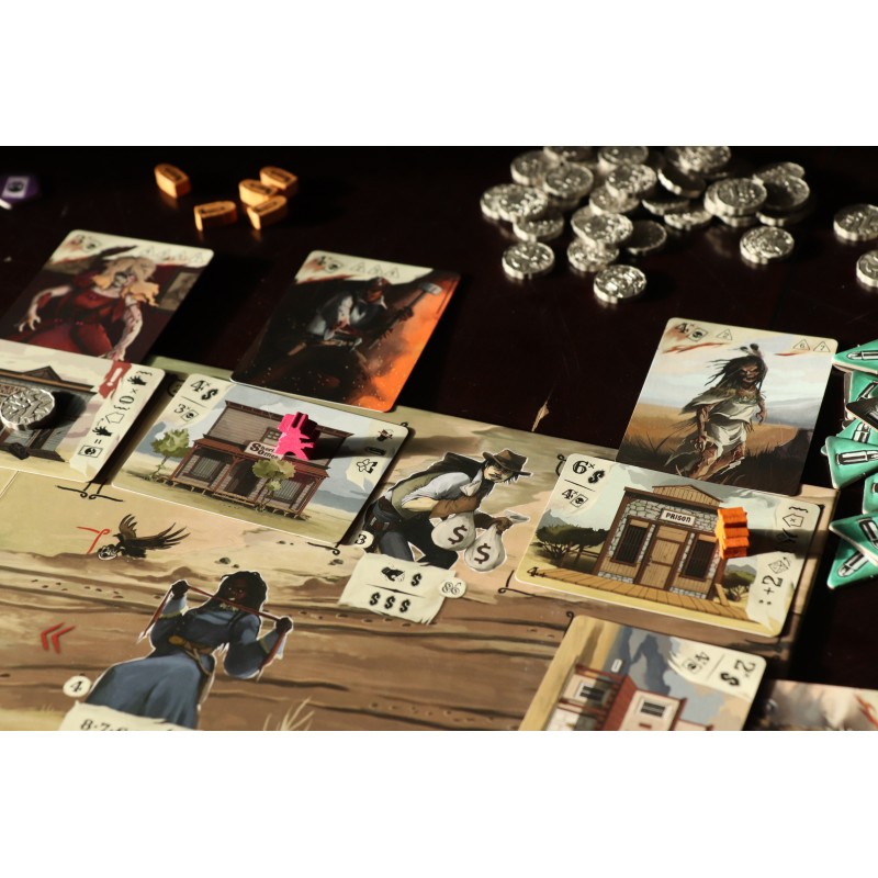 Contenu du jeu : 48 Tokens Argent, 39 Tokens Balles, 36 Meeples Hors-la-loi, 30-1 Tokens de Notoriété, 11-5 Tokens de Notoriété, 20 Cartes Bâtiments, 18 Cartes Morts-vivants, 6 Dés de joueurs (D8,) 6 Cartes Cibles, 6 Tokens Critiques, 3 Règles de jeu (FR/DE/EN) 1 Token Badge de loi, 1 Plateau de jeu.