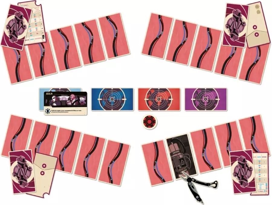 Contenu : 8 cartes Rôle, 8 caches (aides de jeu), 17 cartes Lieu, 40 cartes Câble, 1 pince articulée, 1 carte Pince, 1 jeton Fatalité et les règles du jeu