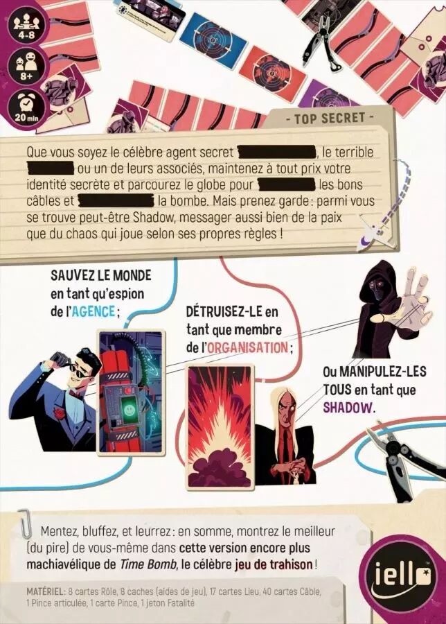 Time Bomb Undercover est une version revisitée de Time Bomb qui ajoute un nouveau rôle supplémentaire, l’Ombre, ainsi que des cartes lieux, qui déclenchent des événements !