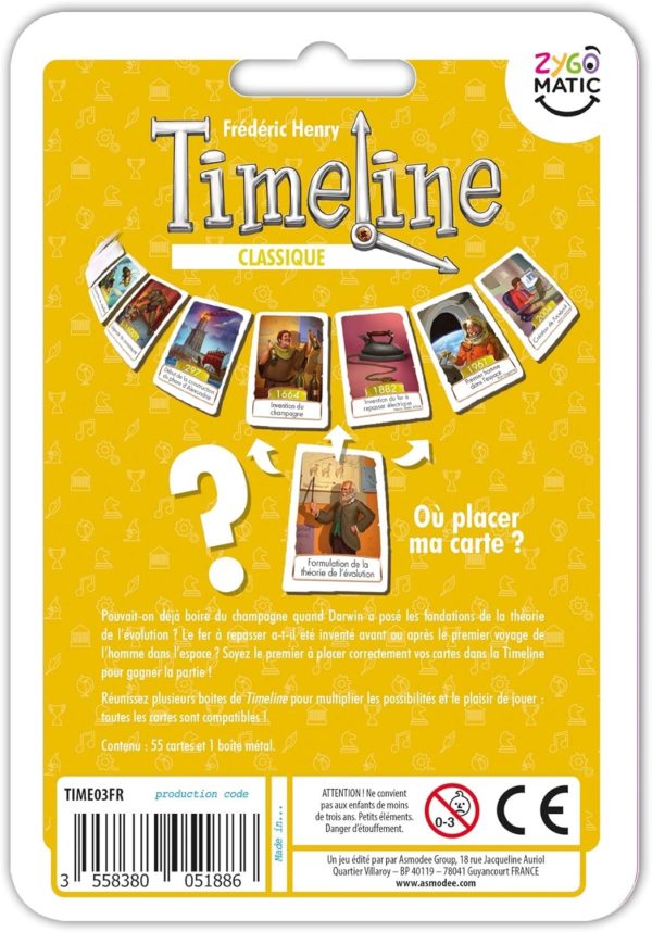 Amusez-vous à replacer les cartes correctement sur la ligne du temps ! Timeline Classique est un jeu de connaissances et de déduction dans lequel vous devrez classer des cartes aux thèmes variés dans le fil de l’histoire. Nouvelle édition, remplace l’ancien Timeline Multi-thèmes.