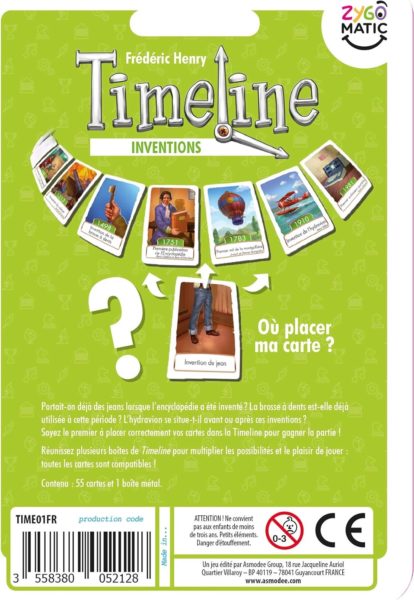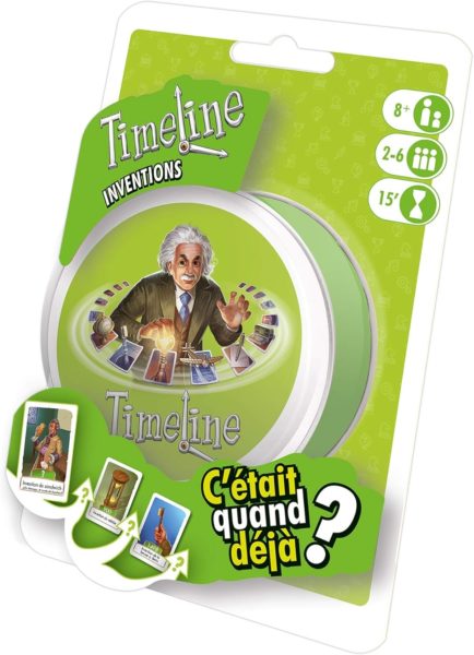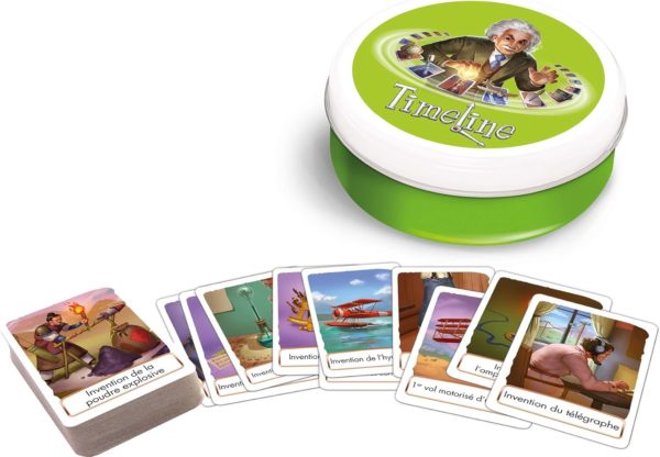 Timeline est un jeu de cartes rapide et amusant avec des règles d’une grande simplicité. En famille ou entre amis, amusez-vous à replacer correctement les cartes dans la ligne du temps. Mobilisez vos connaissances et votre intuition ! Quel que soit le niveau des joueurs et pour toutes les générations, rebondissements et étonnements vous permettront de passer un bon moment en jouant avec le temps.
