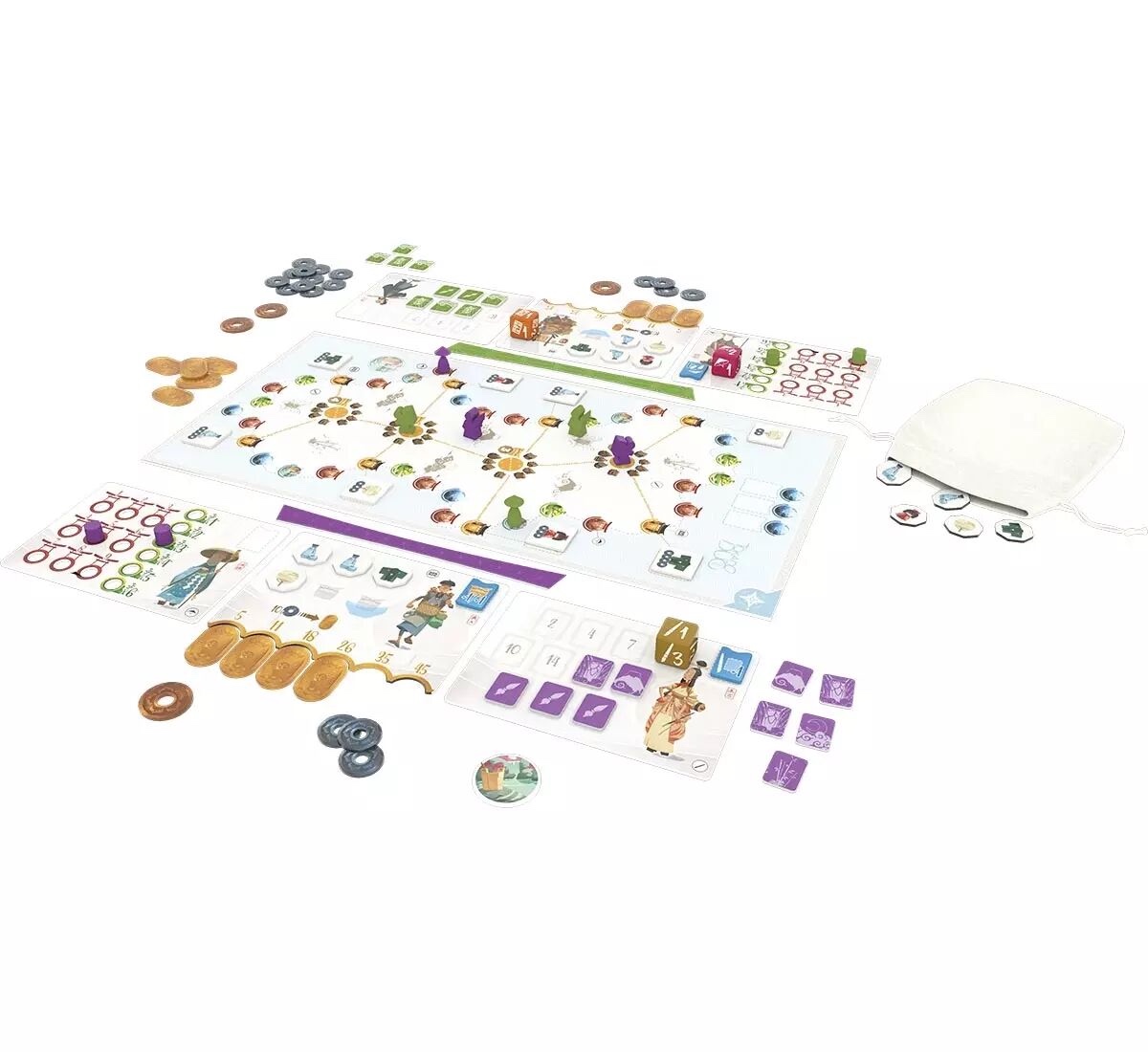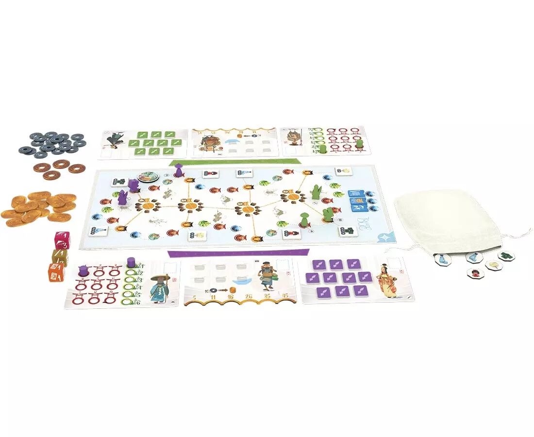 Contenu : 1 plateau de jeu, 6 plateaux Personnage, 6 pions Personnage, 8 jetons Commerce, 26 jetons Marchandise, 20 jetons oeuvre, 2 repères de couleur, 4 marqueurs Visite, 1 jeton Source chaude, 3 jetons Vague, 24 pièces de monnaie, 12 plaquettes d’or, 1 sac en tissu, 3 dés, 1 livret de règles.