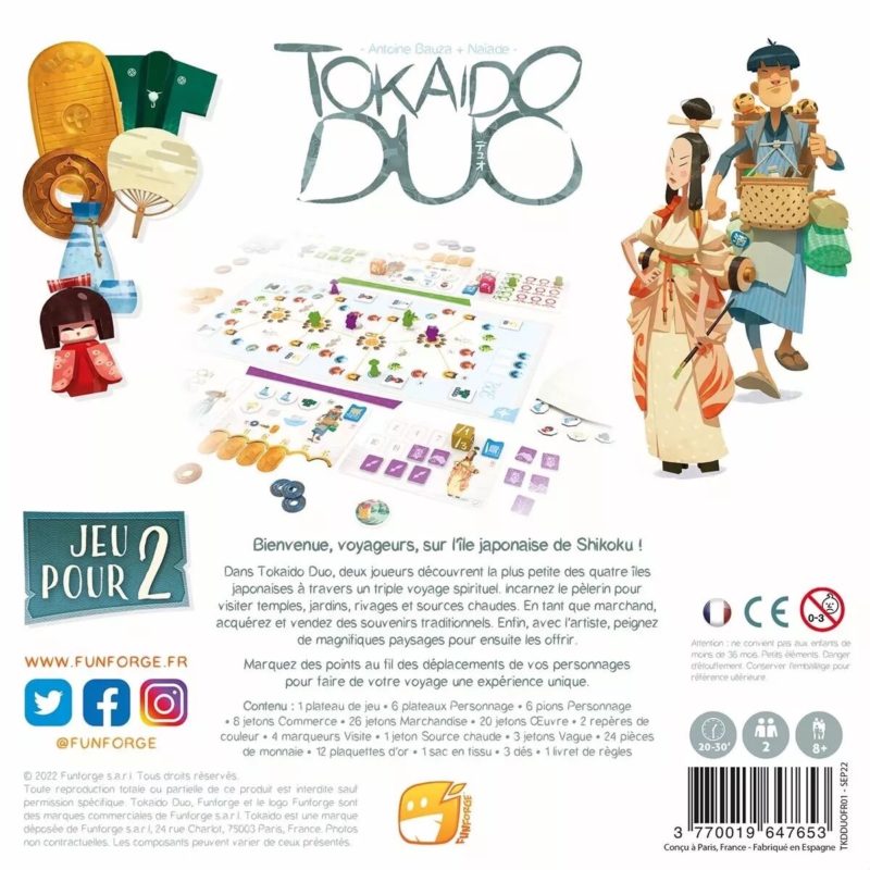 Un Tokaido pour 2 Joueurs…  Bienvenue, voyageurs, sur l’île japonaise de Shikoku ! Dans Tokaido Duo, deux joueurs découvrent la plus petite des quatre iles japonaise à travers un triple voyage spirituel.