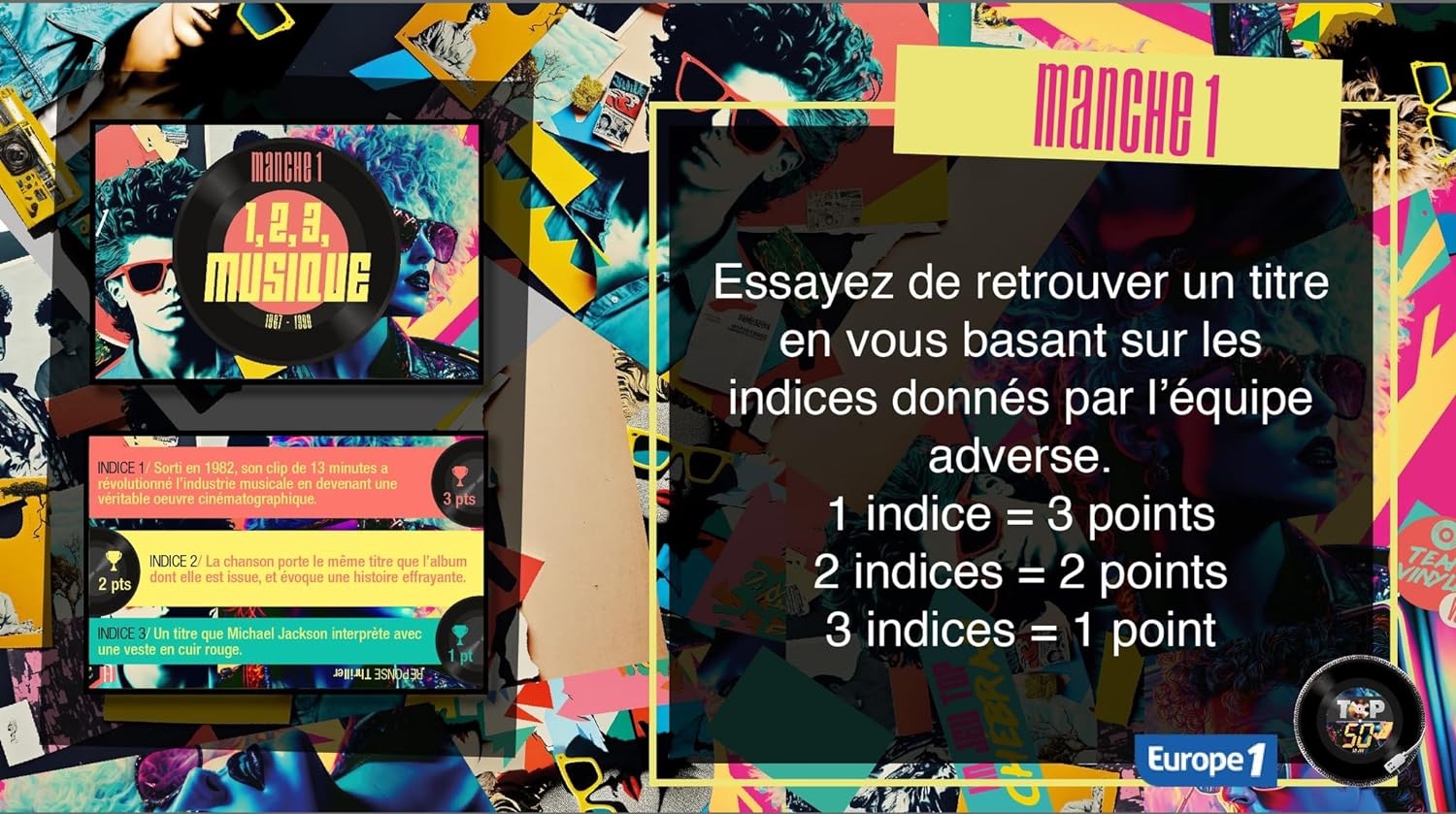 Manche 1 : L’équipe adverse tente de vous faire deviner un titre grâce à trois indices. Si vous devinez le titre au premier indice, c’est 3 points, au deuxième indice c’est 2 points, et enfin 1 point s’il vous a fallu tous les indices.