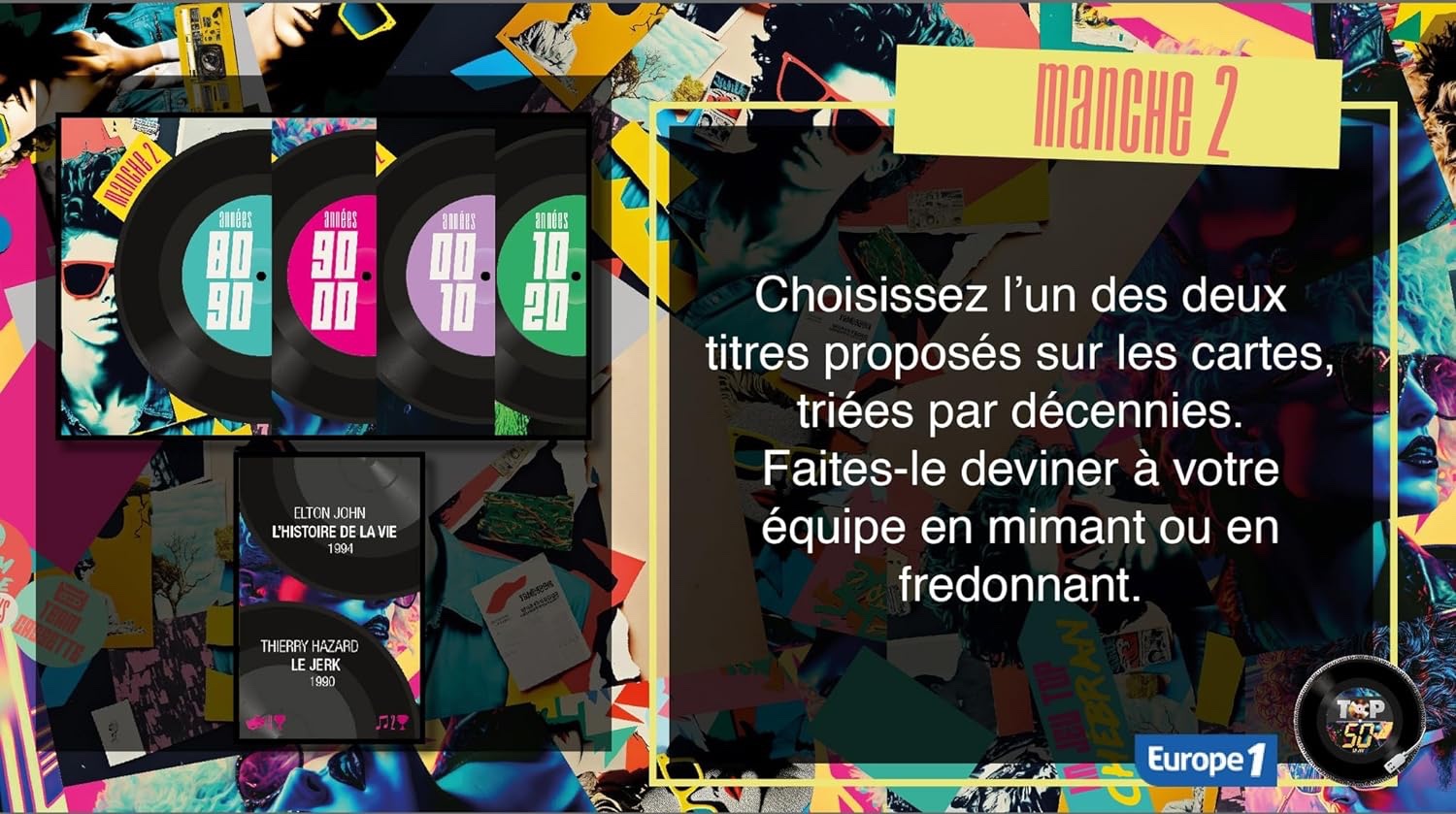 Manche 2 : Vous devez faire deviner un titre à votre équipe. Sur chaque carte, vous avez le choix entre deux titres. 2 points si vous y arrivez en fredonnant, 3 points si vous y arrivez en mimant !