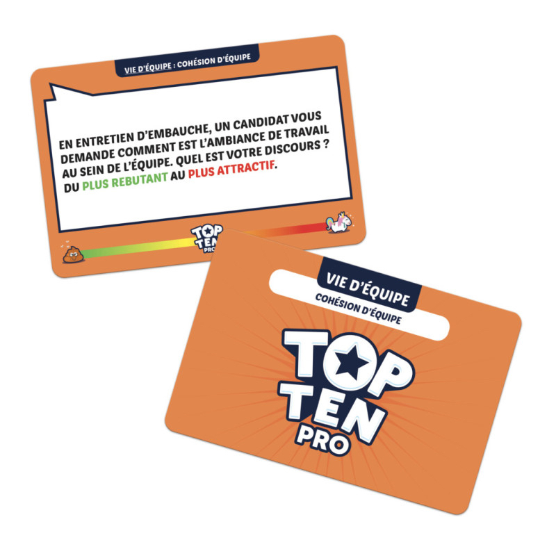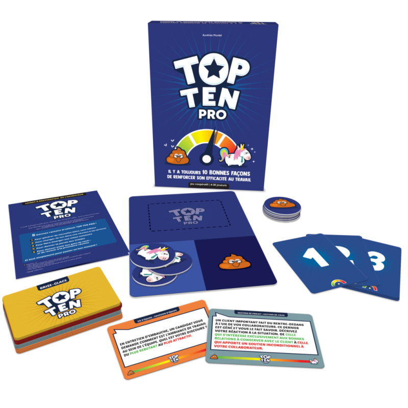 Top Ten Pro est une variante du jeu Top Ten spécialement conçue pour les animateurs de réunions, offrant une approche ludique pour aborder tous les points de vue dans une atmosphère conviviale. Ce jeu conserve la mécanique à succès de TOP TEN, mais avec des contenus adaptés au contexte professionnel.