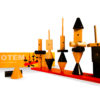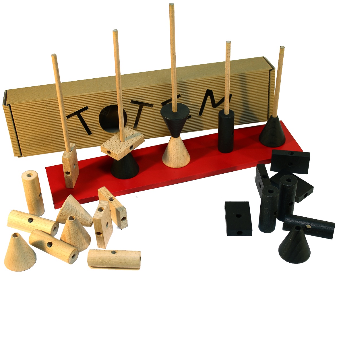 Contenu : 1 Plateau en bois, 5 totems en bois de différentes hauteurs, 8 Parallélépipèdes en bois, 8 Cylindres et 8 cônes en bois. 1 Règle du jeu en 7 langues (F, GB, NL, D, I, E, P).
