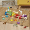 Grâce aux nombreux blocs en bois à placer sur les wagons, les bébés à partir de 12 mois vont apprendre les formes et les couleurs en s’amusant. Le Train Géant Zigolos est un jouet complet que votre enfant appréciera tout particulièrement pour ses jolies couleurs et les animaux rigolos du wagon ! Et pour cause, leur tête montée sur ressort se dandine dès que le véhicule se met en marche ! Le canard, la poulette et le lapin sont prêts à découvrir l’univers de bébé ! On s’amuse recréer à l’identique ou à associer les cubes en bois selon ses envies. Pour plus de confort, les roues sont silencieuses grâce au caoutchouc antidérapant. Longueur de la ficelle : 50 cm. Peinture à l’eau.