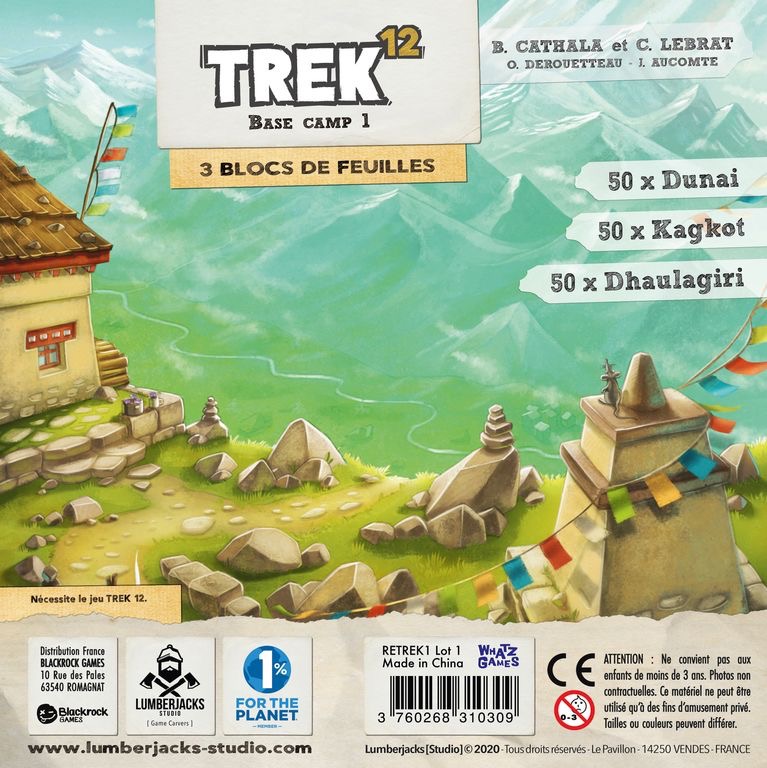 TREK 12 – Base Camp 1…  Repartez à l’aventure dans l’Himalaya avec ces 3 nouveaux Blocs de Feuilles de score : DUNAI / KAGKOT / DHAULAGIRI. Points forts Plus de 5000 boites de TREK 12 vendues en 3 semaines Addictif !!! Déjà de nombreuses demandes de joueurs souhaitant d’autres feuilles. Nécessite le jeu de base Trek 12.