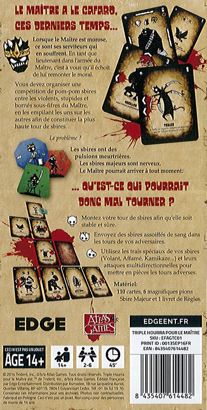 Dans le jeu de cartes Triple Hourra pour le Maître, montez votre tour de sbires afin qu’elle soit stable et sûre. Envoyez des sbires assoiffés de sang dans les tours de vos adversaires. Utilisez les trais spéciaux de vos sbires (Volant, Affamé, Kamikaze…) et leurs attaques multi directionnelles pour mettre en pièces les tours adverses.