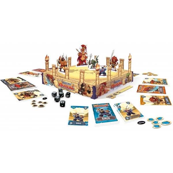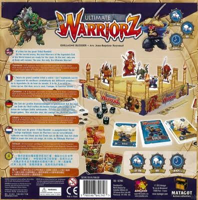 Serez-vous le Guerrier Ultime ? L’heure du grand combat tribal a sonné ! Cet affrontement rituel se déroulant sur l’esplanade sacrée et voyant s’opposer les meilleurs combattants des différents peuples, tribus et clans de la légendaire île du bout du monde va permettre d’en déterminer le chef suprême. À la fin, il ne pourra en rester qu’un ! Alors qui sera le seul, l’unique, le Guerrier Ultime Pour le savoir, à vous de jouer en incarnant l’un des 8 « Ultimate Warriorz » du jeu, du petit mousquetaire marmiton Agaric au puissant dragon rouge spartiate Zamioculcas en passant par Jojoba l’indien goblin, Bonzaï le samouraï nain, Cactus le gladiateur orc, Burdock le highlander lion, Sorgho le matador minotaure et Baobab le barbare homme-arbre ! Pour sortir victorieux de ce combat, placez votre botte secrète au bon moment, utilisez votre objet magique à bon escient et surtout, débrouillez-vous pour ne pas être la cible des attaques adverses ! Prêt Alors que le « Tribal Rumble » commence ! Une esplanade de combat en 3D. Deux modes de jeu différents (chacun pour soi/par équipe). Possibilité de jouer jusqu’à 8 joueurs. La boîte contient 8 figurines cartonnées, 12 socles en plastique transparent, 8 grandes cartes Combattant, 64 grandes cartes Action, 74 pions Point de vie/Point de popularité, 1 pion Crâne de Baobab, 1 pion Filet de Cactus, 3 pions Electroshock de Burdock, 2 pions Flamme de Zamioculcas, 4 murs cartonnés avec colonnes, 8 grands sachets en plastique, 6 dés et un livret de règles.