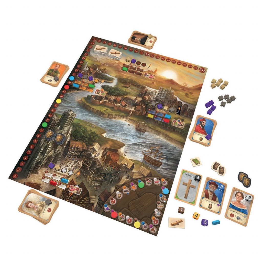 Contenu : 1 plateau, 24 dés, 80 cartes de jeu, 28 jetons Privilège, 16 jetons Protection, 16 maisons de commerce, 30 pions Religion, 56 jetons Marchandise, 2 torches, 4 pions Victoire, 4 pions Action, 1 pion Joueur de départ, 4 croix de masquage et 1 règle du jeu.