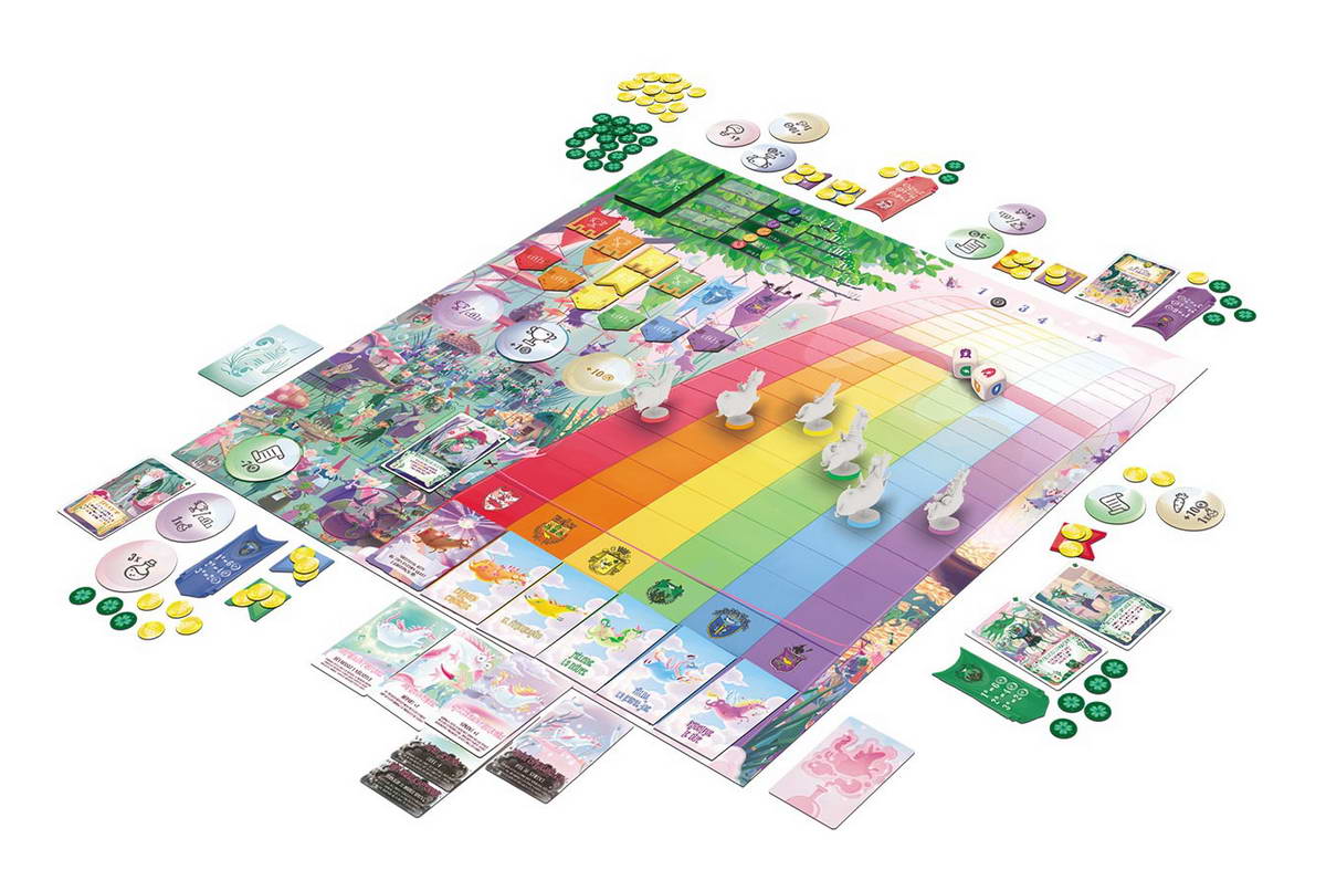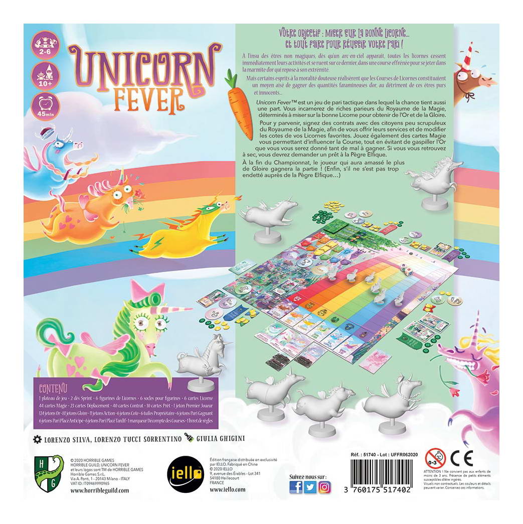 Contenu : 1 plateau de jeu, 2 dés Sprint, 6 figurines de Licornes, 6 socles pour figurines, 6 cartes Licorne, 44 cartes Magie, 23 cartes Déplacement, 40 cartes Contrat, 10 cartes Prêt, 1 jeton Premier Joueur, 124 jetons Or, 81 jetons Gloire, 11 jetons Action, 6 jetons Cote, 6 tuiles Propriétaire, 6 jetons Pari Gagnant,6 jetons Pari Placé Anticipé, 6 jetons Pari Placé Tardif, 1 marqueur Décompte des Courses, 1 livret de règles.