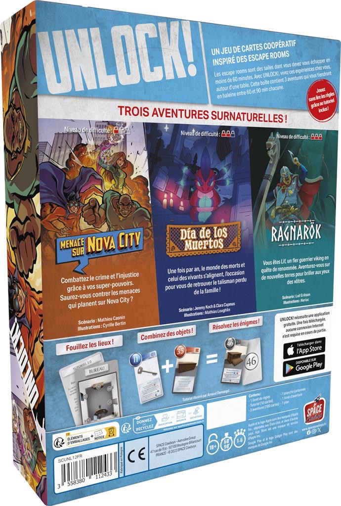 Unlock ! 12 Supernatural Adventures est un jeu de cartes coopératif immersif. Le célèbre jeu inspiré des escape games revient pour une douzième boite ! Retrouvez 3 aventures inédites de 60 minutes, avec 3 niveaux de difficulté, et toujours autant de puzzles et d’énigmes à résoudre, de machines à manipuler, d’objets à combiner et d’évènements à affronter ! Il n’est pas nécessaire de posséder Unlock ! 1, 2, 3, 4, 5, 6, 7, 8, 9, 10 ou 11 pour jouer à Unlock ! n°12