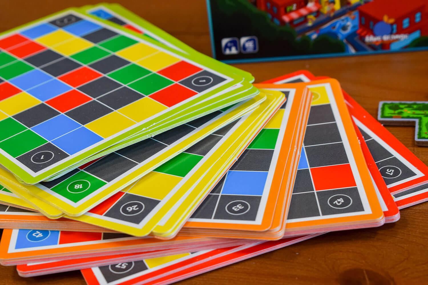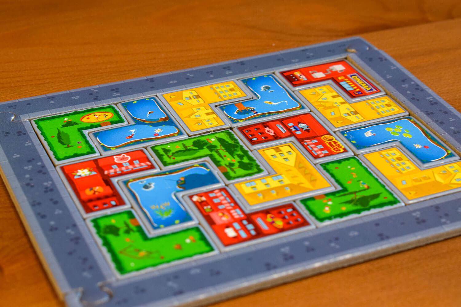 Contenu : 16 tuiles Triomino en L (4 Parcs, 4 Lacs, 4 Commerces et 4 Zones résidentielles), 60 cartes Ville, 1 cadre en forme de puzzle.