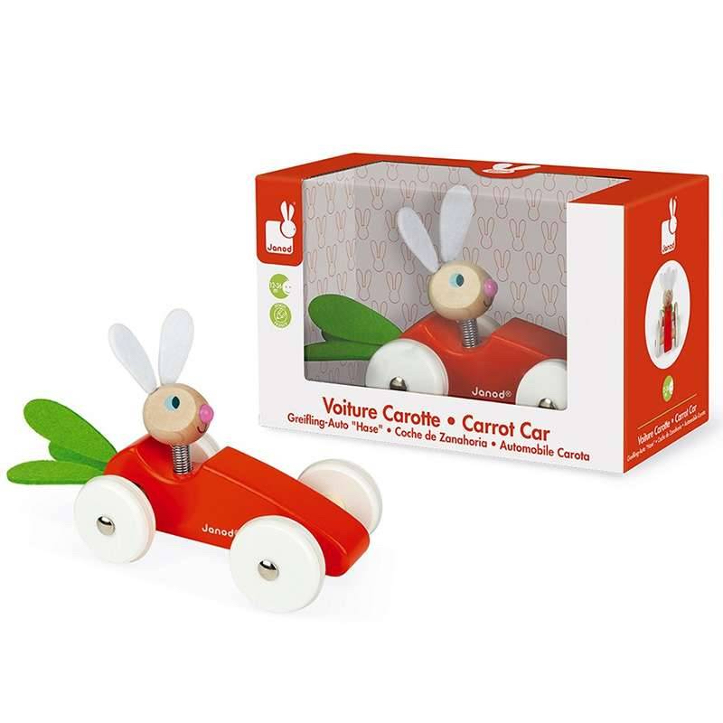 Wroum wroum, notre lapin préféré pilote son nouveau bolide en forme de carotte ! Cette jolie voiture carotte de Janod en bois va aider votre enfant à développer sa motricité. Les roues sont directionnelles pour aller dans tous les sens. Les oreilles du lapin et les fanes de la carotte sont en feutrine pour un toucher tout doux !