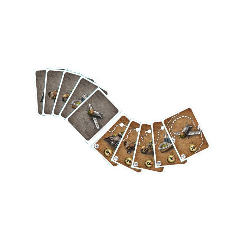 Contenu : 7 cartes personnage, 35 cartes course : 7 paquets (à la couleur des 7 personnages) de 5 cartes véhicule (train,voiture, moto, bateau, avion). 5 cartes hiérarchie (fond gris) :train, voiture, moto, bateau, avion. 8 cartes starter : 2 trains, 2 voitures, 1 moto,1 bateau,2 avions.