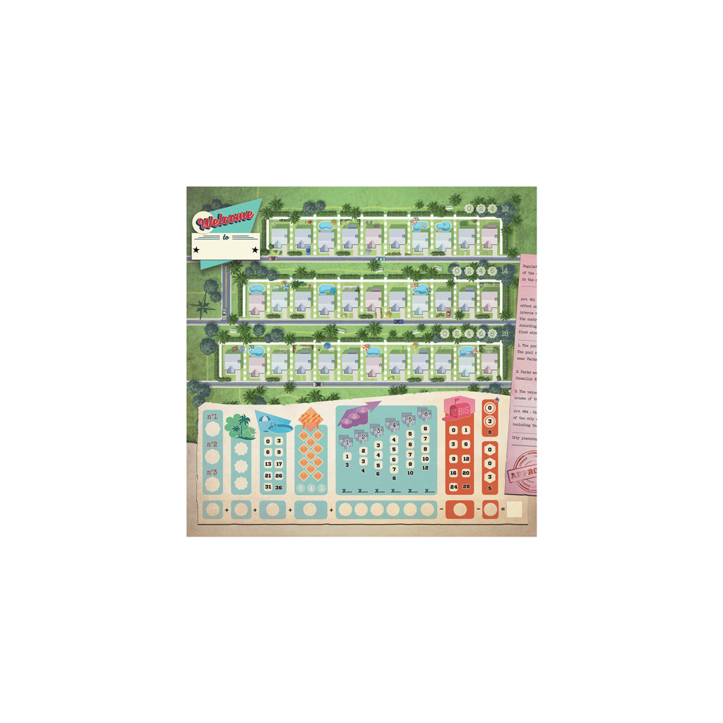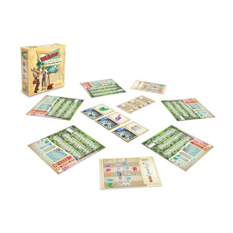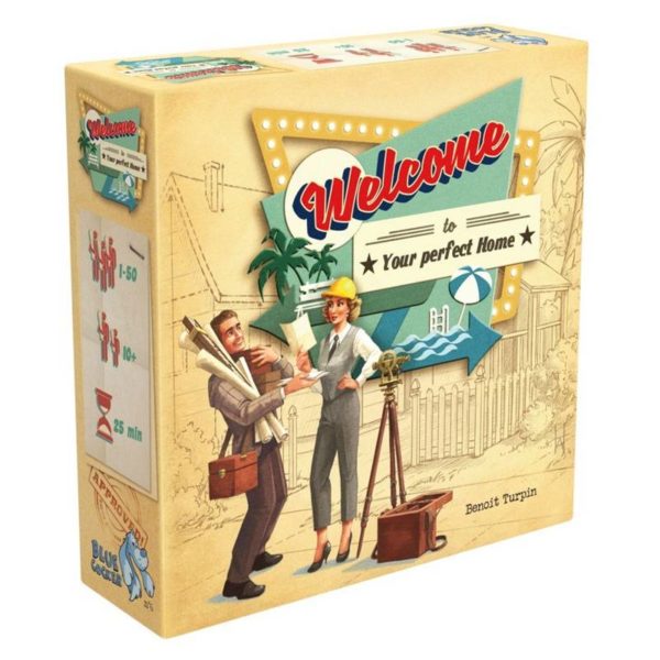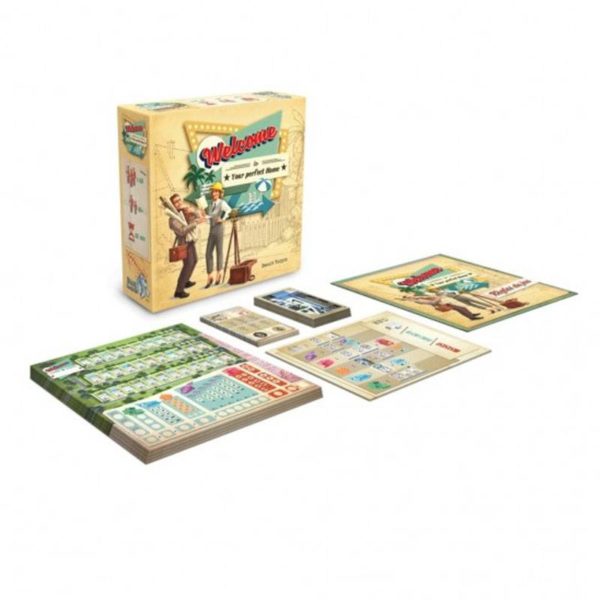 Qui respectera au mieux les plans projetés par la ville en créant dans les trois rues qui lui sont confiées les plus beaux lotissements, avec leurs luxueux parcs et leurs piscines de rêve? Welcome est un jeu où tout le monde joue en même temps avec le même tirage de cartes. Il s’agit alors pour chaque architecte de combiner astucieusement les numéros de maison apparus et les actions qui s’y trouveront associés afin de devenir le ou la plus grand architecte de demain !
