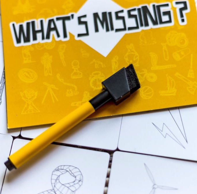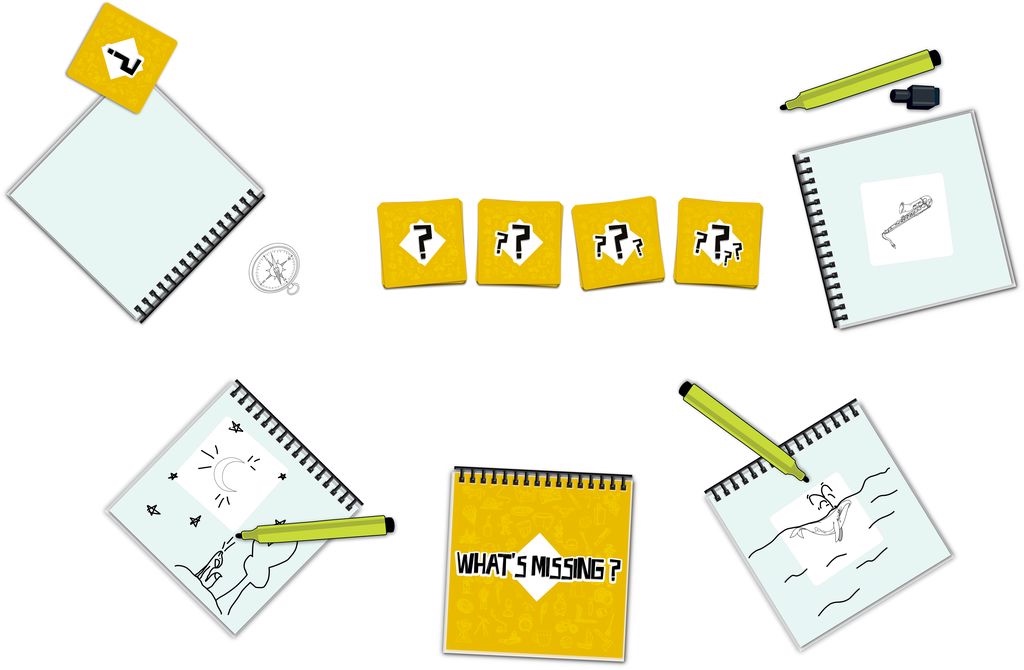 Le premier joueur qui devine ce qu’il y avait sur la carte du joueur actif gagne la carte. Si personne ne devine, le joueur actif doit remettre dans la boite une des cartes qu’il avait gagnées s’il en a une, plus celle qu’il n’a pas réussi à faire deviner bien sûr. Le vainqueur sera celui qui aura le plus de cartes à la fin de la partie (7 ou nb de tours ou temps de jeu). What’s Missing est un jeu d’imagination dans lequel vous allez devoir dessiner pour faire deviner une image. Mais au lieu de représenter cette image, vous devrez imaginer et dessiner ce qui peut entourer la chose faire deviner.