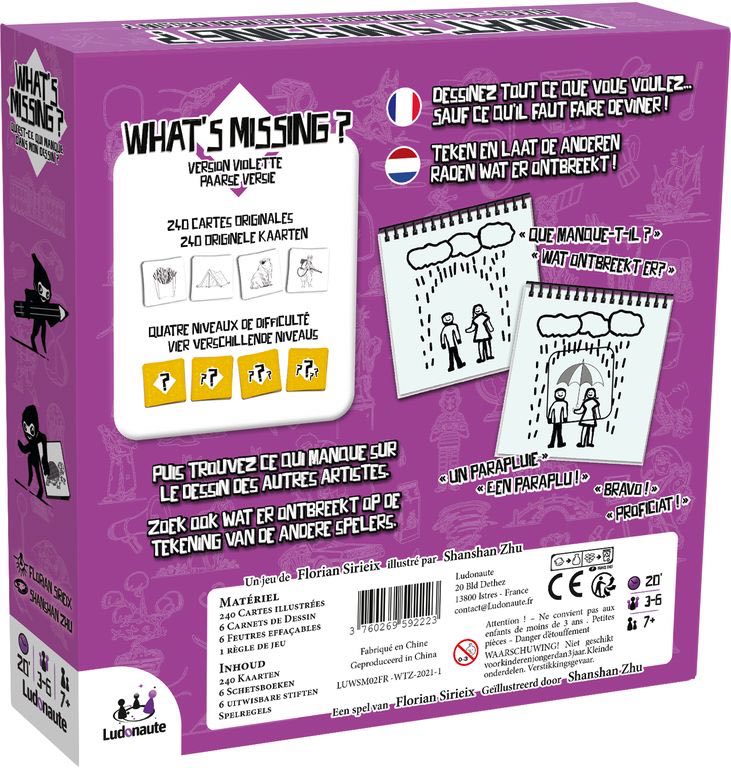 What’s Missing ? revient dans sa nouvelle édition violette, et s’enrichit de 240 nouvelles cartes et d’un niveau de difficulté supplémentaire. Le principe reste le même : Au lieu de représenter l’image piochée, il faut dessiner tout autour des éléments qui la replacent dans son environnement. Les autres joueurs doivent ainsi retrouver ce que vous n’avez pas dessiné.