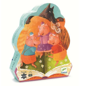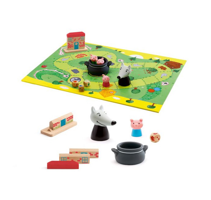 Woolfy de Djeco, est un jeu de parcours et de construction coopératif, inspiré du conte des trois petits cochons.