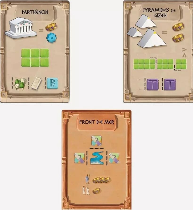 Les règles sont simples, mais les contraintes de pose vont vous faire gamberger sur le choix de votre bâtiment, sa pose, est-ce que ça vous donne accès à une merveille, est-ce qu’un autre joueur pourrait vous couper l’herbe sous le pied ?