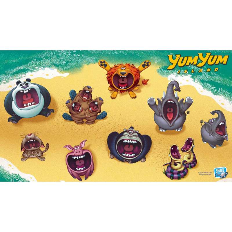 Chaque animal est représenté par une découpe en carton comportant un deuxième niveau surélevé permettant d’identifier la gueule de l’animal. Dans la bouche se trouvent une paire de chiffres – un vert et un rouge – qui indique la quantité de nourriture végétarienne et à base de viande dont l’animal a besoin pour être satisfait.