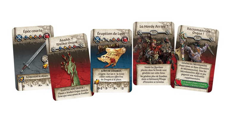 Matériel : 72 Figurines, 6 Survivants, 35 Walkers Orques, 14 Fatties Orques, 14 Runners Orques, 1 Abomination Orque, 1 Nécromancien Orque, 1 Trébuchet, 9 Dalles de jeu (recto-verso), 6 Tableaux de bord de Survivant avec leur Fiche d’identité, 6 Socles de Survivant colorés, 6 Dés, 48 Pointeurs, 79 Cartes Équipement, 54 Cartes Zombie, 68 Pions.